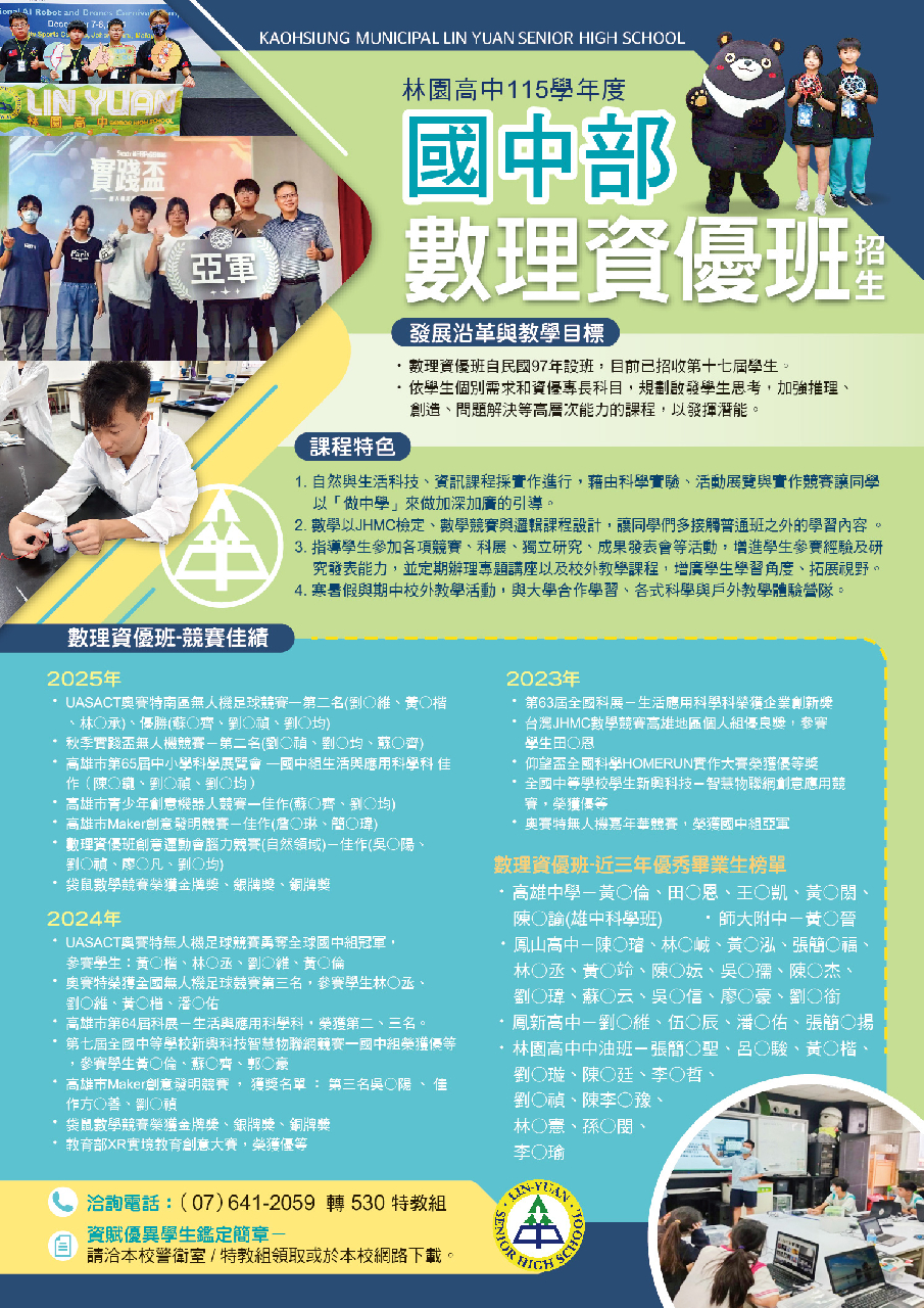 高雄市115學年度國民中學學術性向資賦優異學生 鑑定簡章,請詳閱。★網路報名詳細說明-註冊帳號、網路報名、補件、繳費單下載、鑑定證下載、成績通知單下載方式https://gift.spec.kh.edu.tw/modules/tad_book3/index.php?op=list_docs&tbsn=14